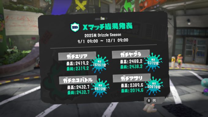 2025秋 Drizzle SeasonのXマッチの記録を残しておきます。